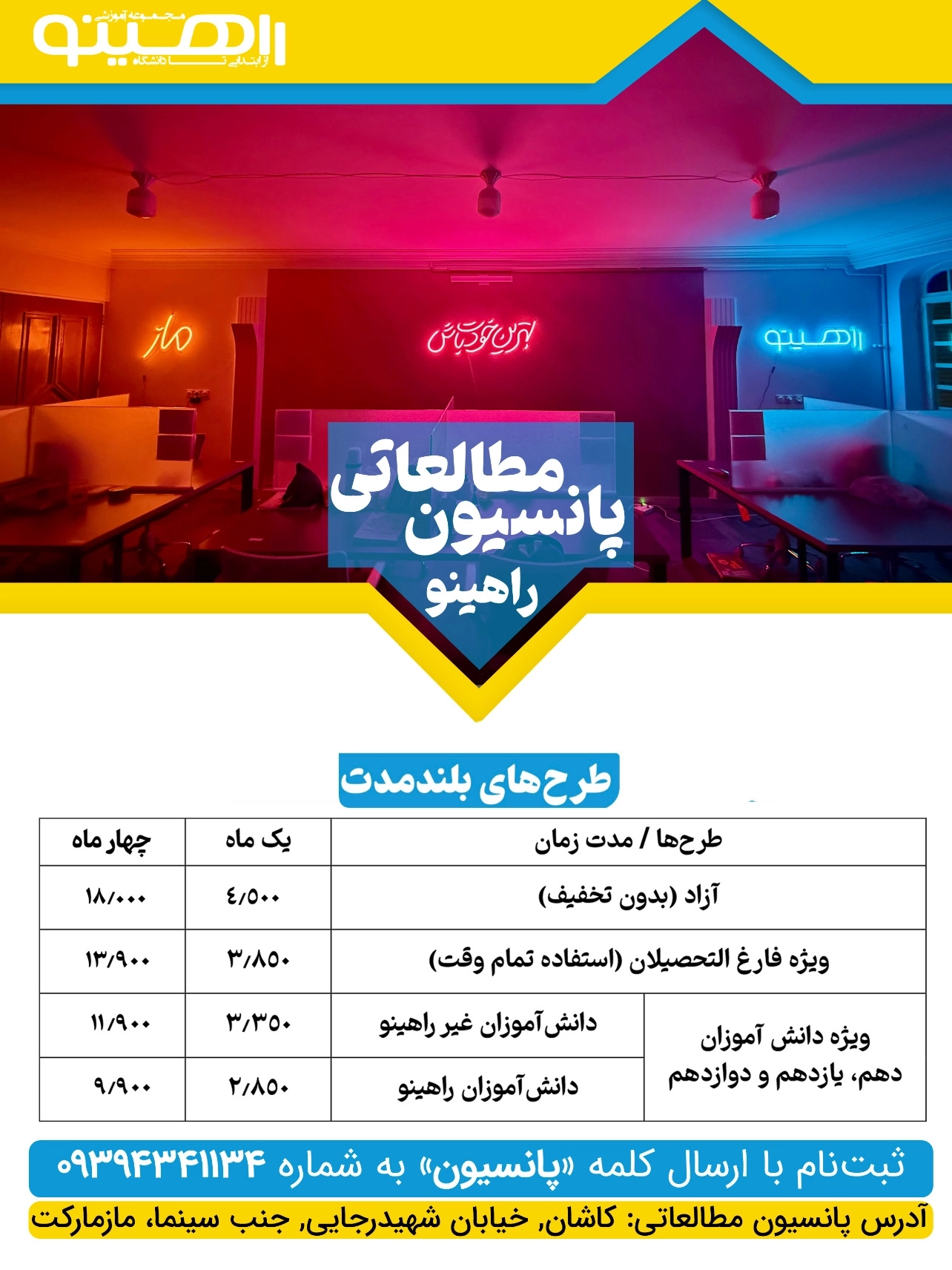 حالا راهینو بعد از 11 سال برگزاری اردو های مطالعاتی در مقاطع حساس امسال پانسیون سالیانه ی مطالعاتیش رو آغاز کرده که در طی سال همواره همراه شما باشه